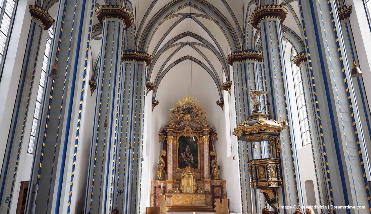 Inside, the style resembles a Gothic hall church. The restored rib vault and pillar painting is a highlight, but the theme of names continues. Each vault is named for a saint, except the easternmost, given to Christ, and the surrounding vaults named for the Holy Family and its forebears.